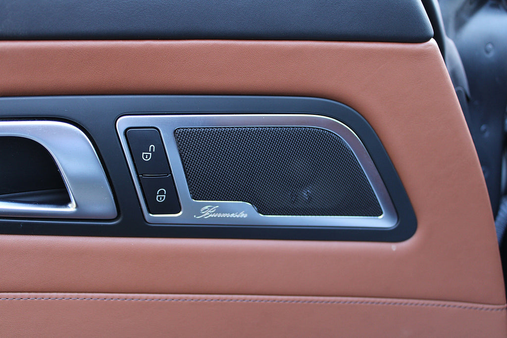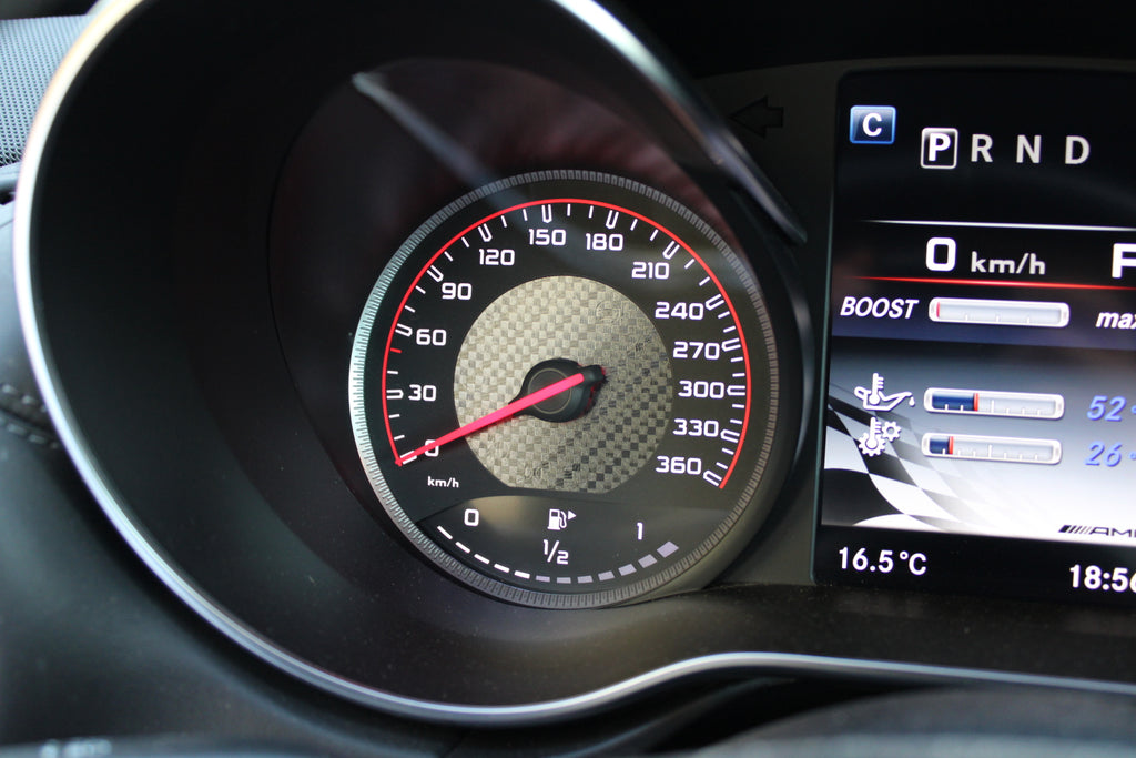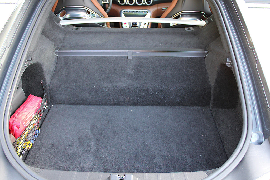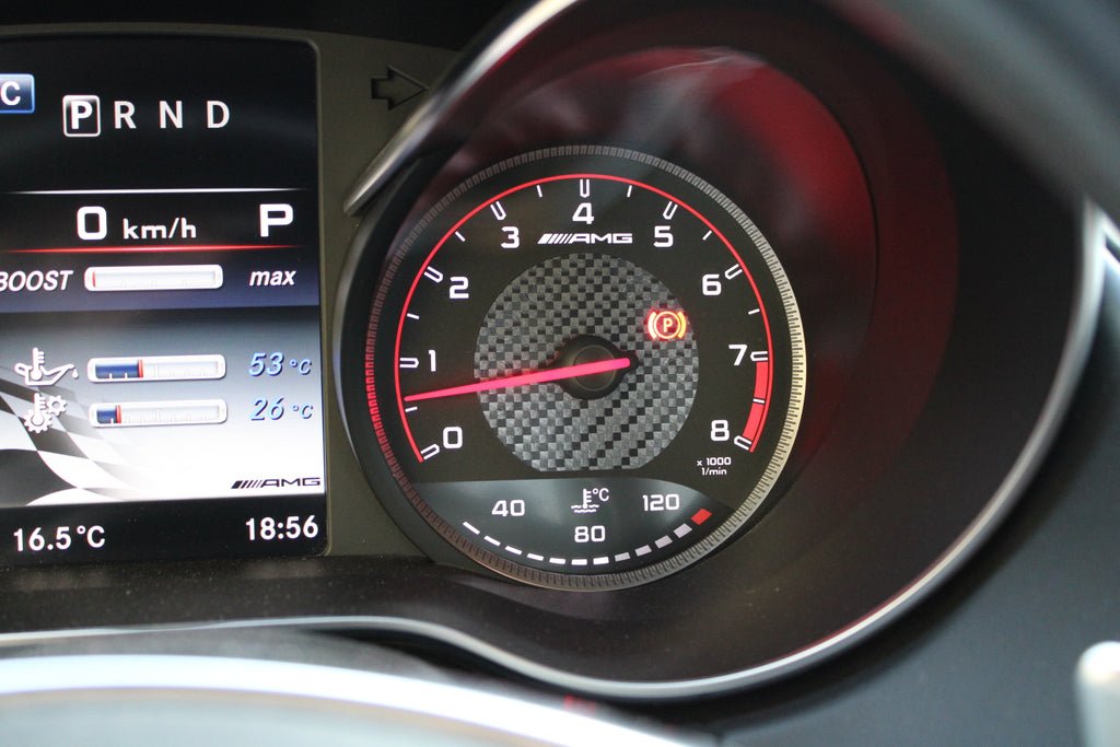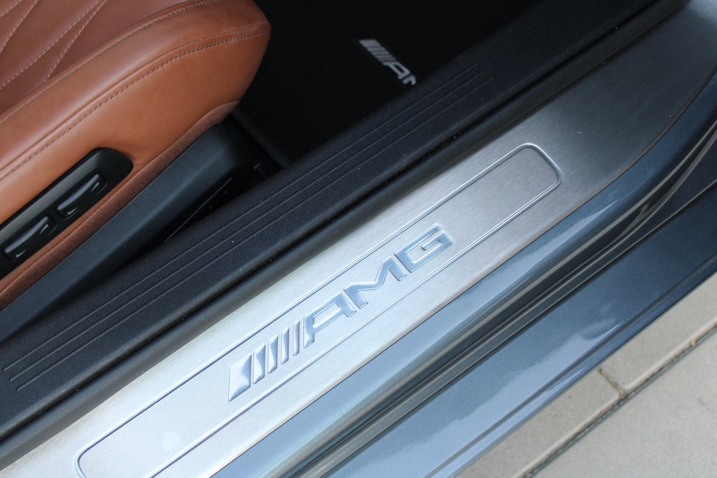 Der Innenraum des GTS ist in stilvollem braunen Leder (Farbcode 564A9) gehalten. Zu den ersten Besonderheiten, die den Insassen auffallen werden, gehören die aufpreispflichtigen AMG-Performance-Sitze, das große Glasdach und das Premium-Soundsystem. Für Sicherheit an Bord sorgen ein Totwinkel-Assistent, ein Kollisionswarner mit aktivem Bremseingriff sowie diverse Airbags für Fahrer und Beifahrer (Front-, Seiten-, Becken- und Dachairbags). Weitere Annehmlichkeiten sind Sitzheizung, Rückfahrkamera, ein Memory-Paket für Sitze, Lenksäule und Spiegel, Verkehrszeichenerkennung, Keyless-Go und eine automatische Fernlichtschaltung. Um das Ganze von außen abzurunden, wurde das AMG-Night-Paket konfiguriert, wodurch alle Exterieur-Elemente schwarz gehalten sind.